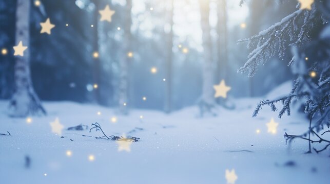 Enchanting snow background with subtle bokeh effects and scattered sparkling stars, softly blurred for a dreamy winter vibe.