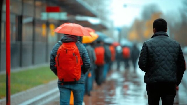Rainy Commute: An anonymous individual navigates a rain-soaked street, their red umbrella providing a splash of color against the dreary backdrop, while others follow in the distance.