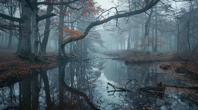 Gloomy Ocean Coastline With Dark Forested Cliffs Under Stormy Skies