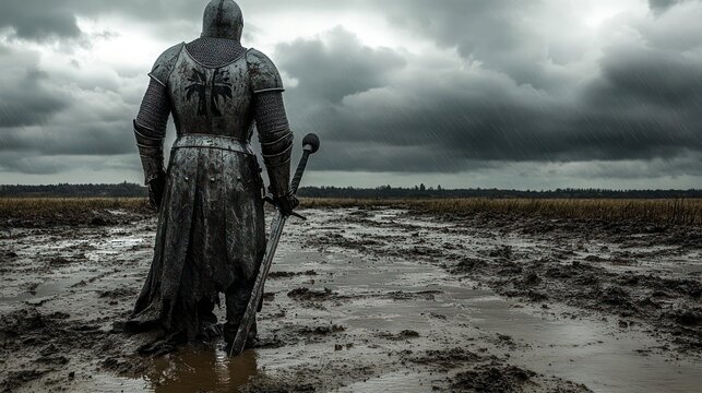 Medieval Knight in Pixelated Armor Stands in a Muddy Field Under a Stormy Sky with Sword