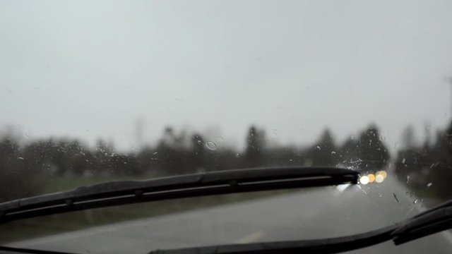 Driving in rain, out of focus background and headlights, dreary day, handheld.
