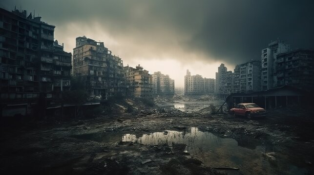 A future post-apocalyptic city, broken and dreary with broken buildings and a derelict urban landscape. Explore the darkness of this AI generative