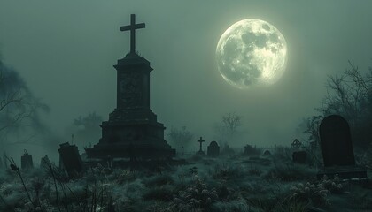cemetery cross full moon background cryptocurrency last day earth dreary clothes gray fog dead old tombs