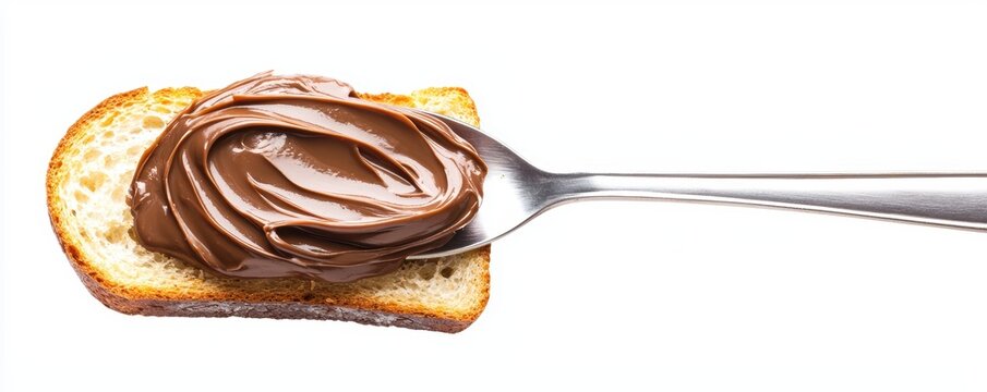 Indulgent chocolate spread swirled over a fluffy slice of bread, with a shiny spoon adding depth and contrast to the composition