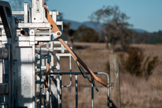 ear tagging equipment and worm drenching gun rady to treat cows and sheep in Australia in the cattle yards