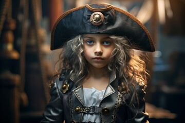 Child dressed as a pirate captain on a ship deck, soft sunlight highlighting their determined expression