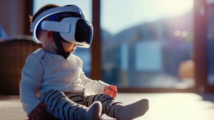A newborn baby, dressed warmly for comfort, sits curiously with a VR headset on, in front of a bright window streaming sunlight.