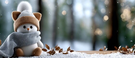 A joyful snowman stands in a peaceful winter forest, dressed warmly with a hat and scarf, surrounded by fresh snow and pine trees