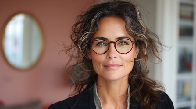 A woman with curly hair and glasses smiles warmly at the camera. She has a natural look and is dressed casually, with a soft background featuring a round mirror and a hint of interior decor.