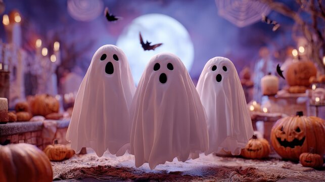 Three people dressed as ghosts stand outdoors among orange pumpkins during daylight, creating a spooky Halloween-themed scene.