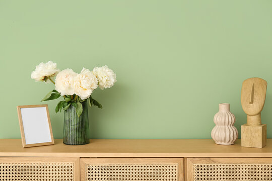 Vase of white peonies with photo frame and figurine on dresser near green wall