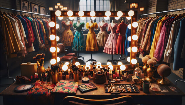 Actor's dressing room, lit by bulbs, with costumes hanging - Behind the scenes - AI Generated