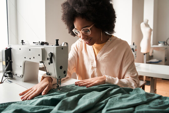 Young african american dressmaker woman sews clothes on sewing machine at tailor office it tropical summer style