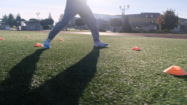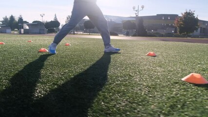 Football player training on a field. Man in light blue hoodie and purple pants, practicing agility drills with orange cones