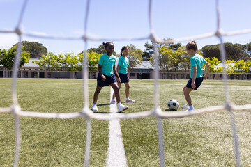 Diverse teenage girls in green on drill dribbling soccer balls training passing at school with net