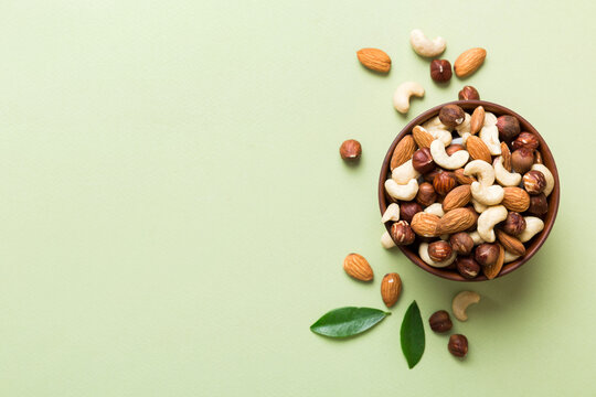 Assortment of nuts in wooden bowl on colored table. Cashew, hazelnuts, walnuts, almonds. Mix of nuts Top view with copy space