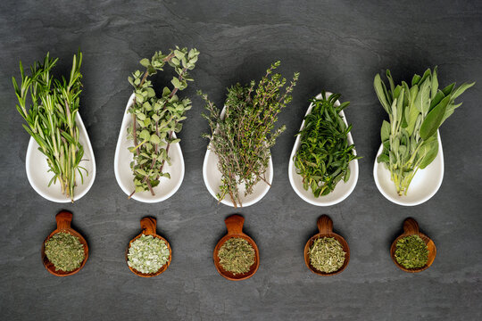 Five different fresh organic herbs in porcelain bowls and dried herbs in wooden bowls stand on a black slate plate