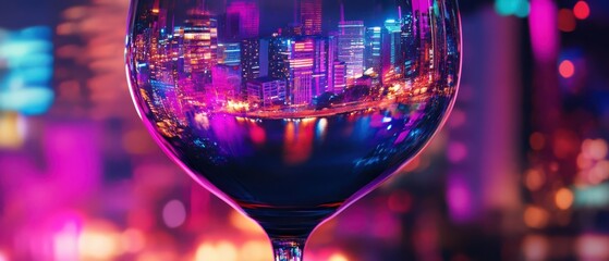 Wine Glass Reflecting Cyberpunk Cityscape of Groningen at Sunset with Neon Lights