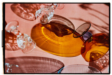 Colorful glassware casting shadows on a textured surface