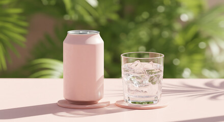 Refreshing pink can and ice water, set against a tropical backdrop. Perfect for summer vibes, beverage marketing, and a relaxing mood