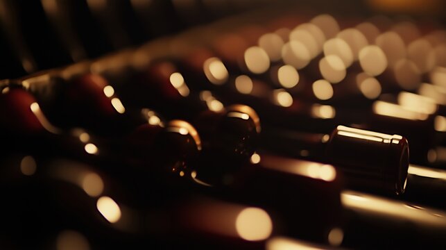 A row of wine bottles in focus, soft background blur; elegance and craftsmanship in every detail.