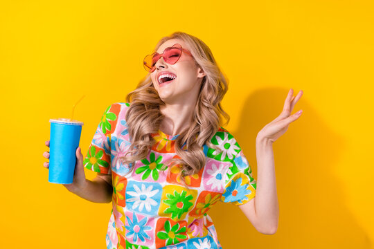 Photo cute dancing lady drink nonalcoholic beverage youth party wear heart sunglass print shirt isolated yellow color background