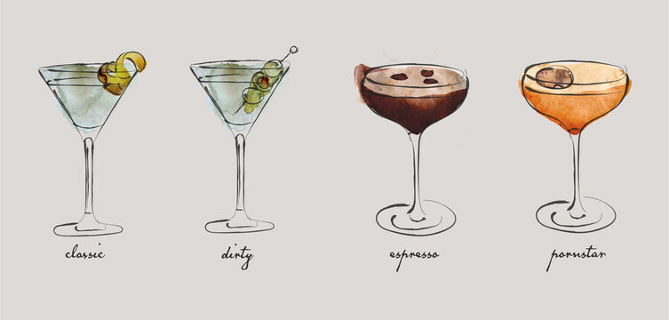 Types of martinis, cocktails, drinks, martini, classic, dirty, espresso, pornstar, bar, watercolour illustration