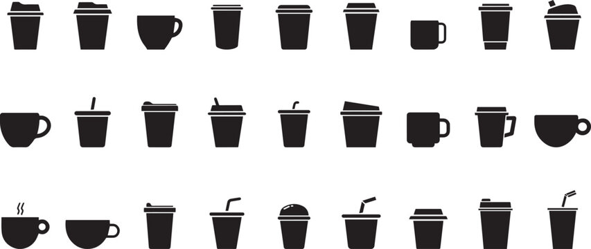 A collection of various cup and drink container icons, including coffee cups, take-out cups, and cups with lids and straws. The designs feature minimalistic, black silhouettes of containers typically