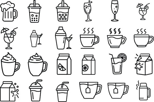 Set of 24 outline icons related to drink and beverages. Linear icon collection. Editable stroke. Vector illustration