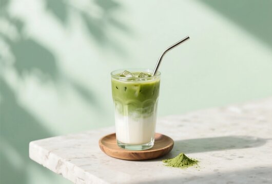 Layered iced matcha latte in tall glass with oat milk, pastel green background, beverage photography for modern healthy drink visuals