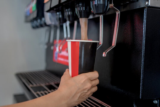 Hand selecting a chilled, condensation covered drink can from a shelf