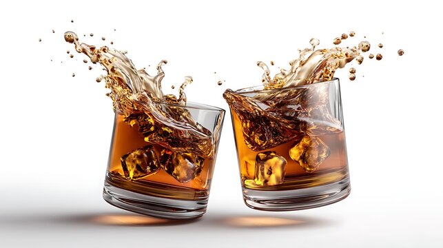 Whiskey splash mockup alcohol cheers isolated glass collision freeze drink splash background white
