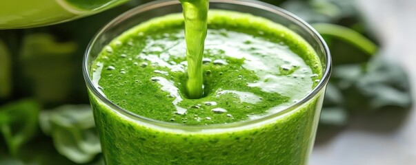 Spinach smoothie being poured into a glass, brain-boosting drink, vibrant green health beverage