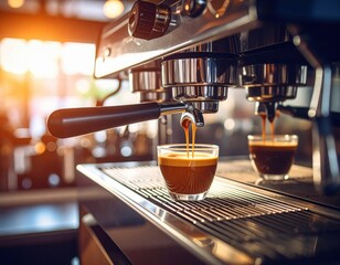 Espresso poruing from coffee machine at cafe