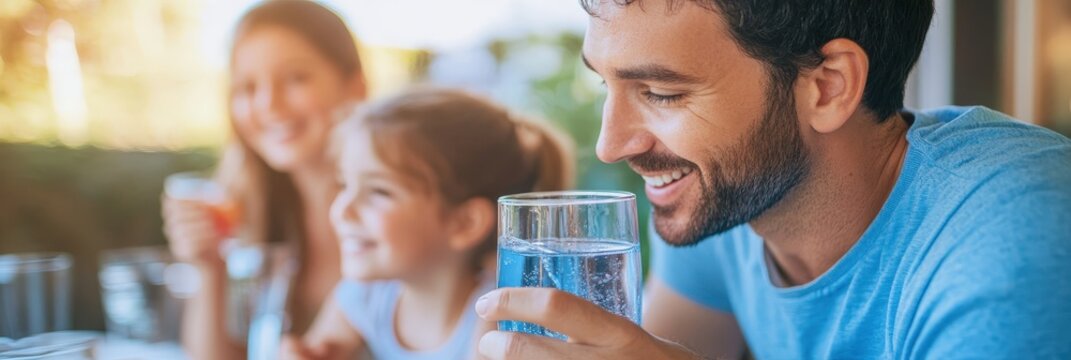 Sustainable living with family hydration, family gathered on the patio, teaching children the importance of clean drinking water and environmental care
