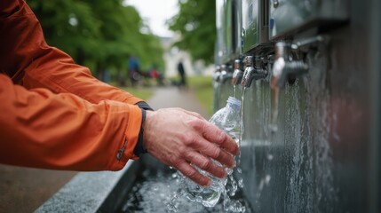 Person Filling Reusable Bottle at Public Park Water Fountain