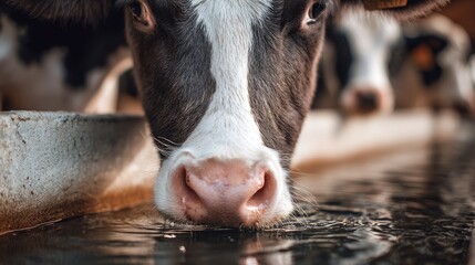 Healthy cow drinking water from farm trough. Healthy livestock. Sustainable farming concept