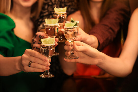 Emotional coworkers drinking shots in golden light bar closeup. People toasting