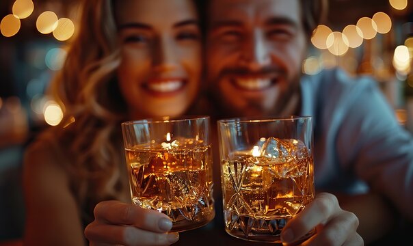 A couple in love cheers with shot glasses, drinking alcohol together at a party, capturing the essence of a lively celebration and the lifestyle of Caucasian people.
