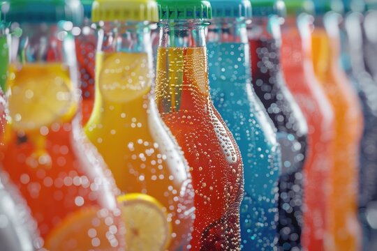 Row of soda bottles with various colored drinks, perfect for beverage industry promotions