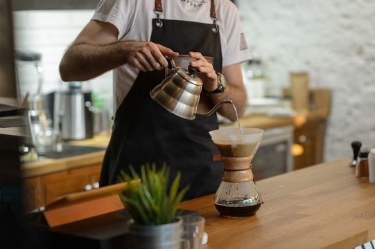 Bartender brewing coffee into pot