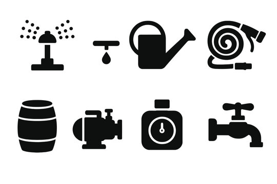 Water Efficiency Icons. Water efficiency icon set in silhouette bold style. Contain low-flow faucet, drip icon, rain barrel, water meter, irrigation line, reuse