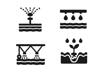 Agriculture irrigation system vector icon set. Smart farming concept. Includes sprinkler, drip irrigation, center pivot, and plant watering symbols. Solid glyph style.