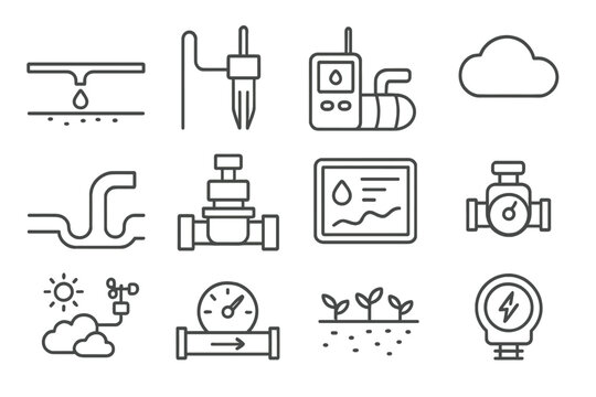 Smart Irrigation Icons. Line style icons of Smart Irrigation Systems: drip line, moisture sensor, control unit, water pump;