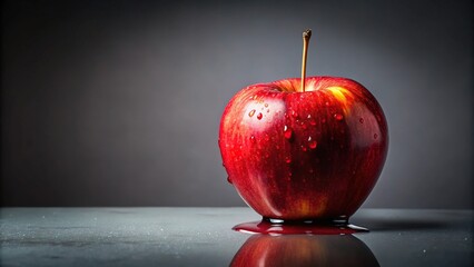 A single red apple dripping with juice onto a dull grey background, autumn theme, juicy fruit