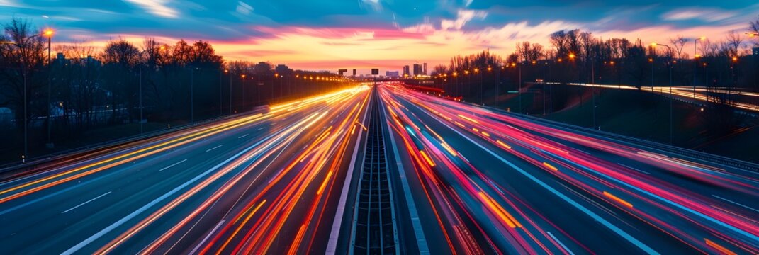 Highway traffic in sunset. Road with metal safety barrier or rail. cars on the asphalt under the cloudy sky