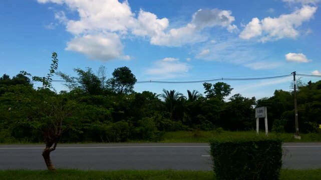 Moving Car Passing Green Tropical Vegetation and Palm Trees under Bright Blue Sky with Clouds Roadside Nature View