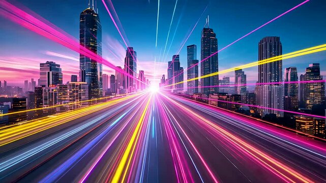 Futuristic Speed Light Trails Across City Highway Surrounded by Skyscrapers During Vibrant Dusk Hour