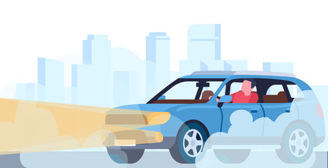 Car slowly drives down road in heavy fog with headlights on. Sedan automobile with bright lights urban landscape. Auto with glowing xenon lamps cartoon flat style isolated png concept