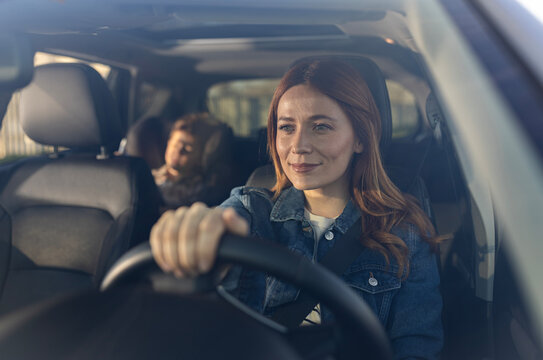 Carefree woman enjoying in journey while traveling through nature with camper van.